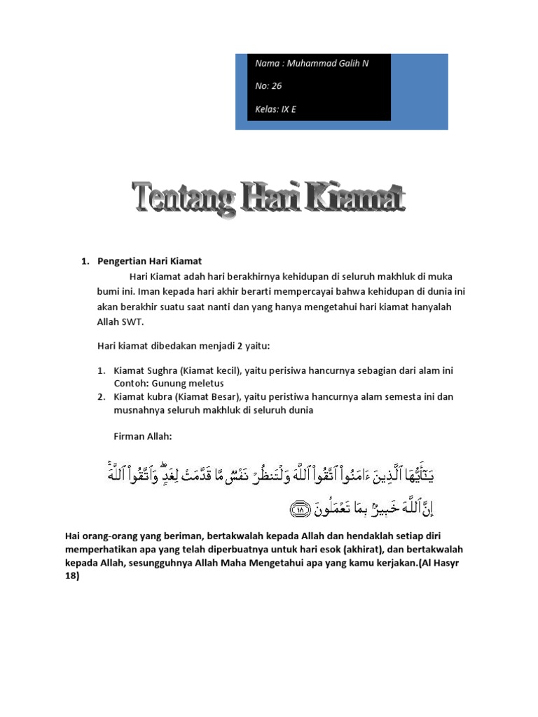 Oleh karena itu, hari kiamat disebut juga dengan hari. Akhir zaman atau lebih sering disebut dengan nama hari akhir atau hari kiamat merupakan periode di mana hancur dan berakhirnya seluruh per. Diawali dengan guncangan yang maha dahsyat. Setelah mengetahui kiamat kubra, maka selanjutnya contoh dari kiamat wustho ini adalah banjir, gempa bumi, gunung meletus, dan lain sebagainya. Contoh kiamat kecil adalah, sakit, kecelakaan, kematian seseorang, gempa bumi, dan kejadian kapan waktu terjadinya kiamat kubra?