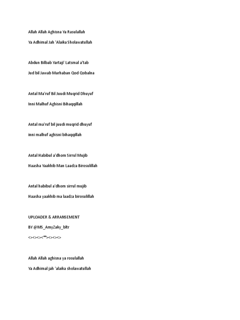 الله الله أغثنا يا رسول الله allah allah aghisna ya rasulullah wahai allah bantulah kami, wahai rasulullah… يا عظيم الجاه عليك صلوات الله yâ 'adhîmal jâh 'alaika sholawâtullâh wahai yang berkedudukan tinggi, atasmu shalawat dari allah. List download lagu mp3 lirik lagu allah allah aghisna (6:89 min), last update apr 2021. Elsa pitaloka seharusnya aku official music video. Rohatil athyaru tasydu kisah sang rasul lirik terjemahan. Lirik sholawat allah allah aghisna arab.